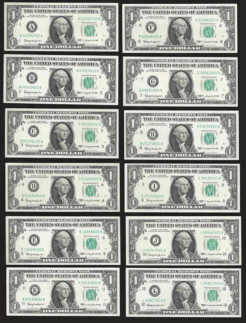 One District Set of (12) 1963 $1 Federal Reserve Notes Uncirculated.