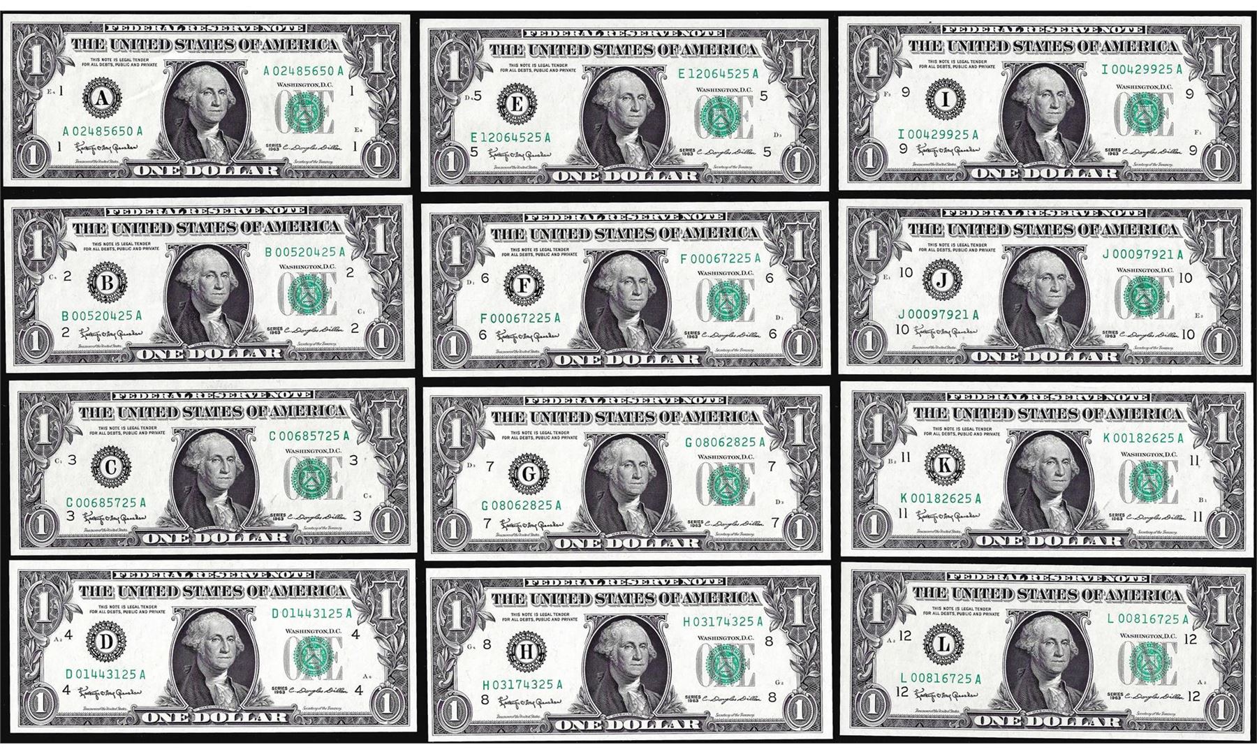 One District Set of (12) 1963 $1 Federal Reserve Notes.