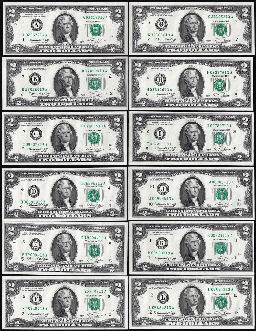 One District Set of (12) 1976 $2 Federal Reserve Notes.