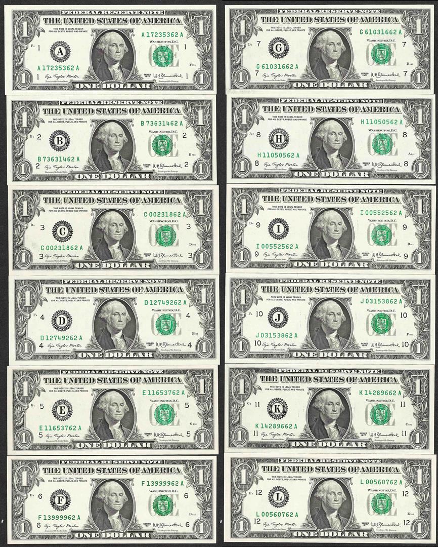 One District Set of (12) 1977 $1 Federal Reserve Notes.