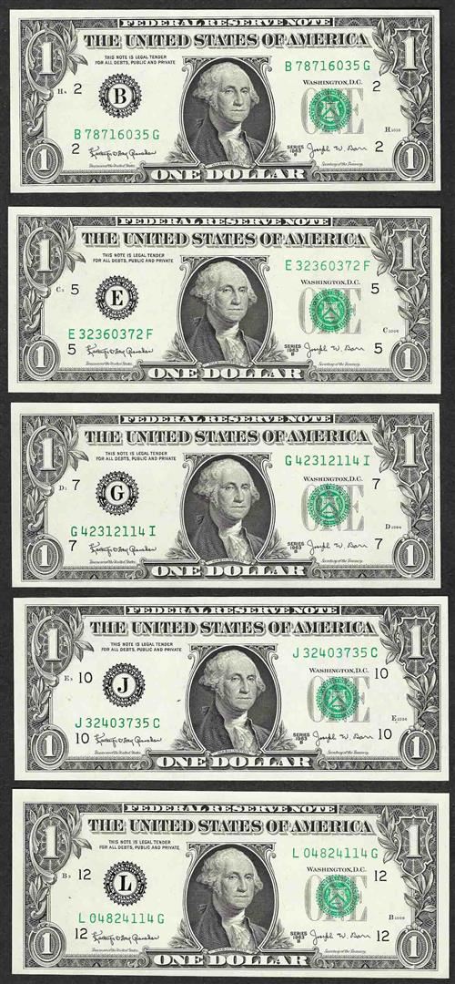 District Set of 1963B $1 Federal Reserve BARR Uncirculated Notes