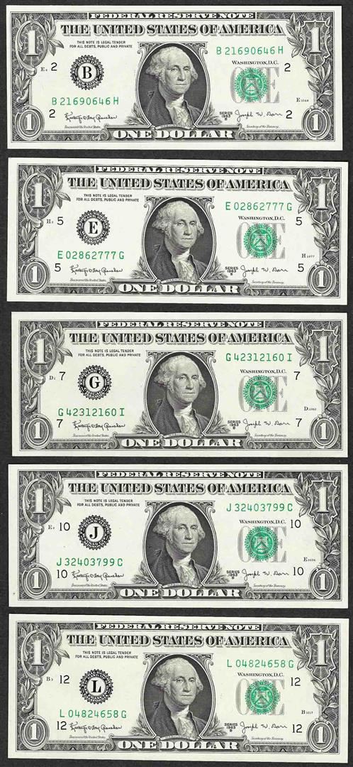 District Set of 1963B $1 Federal Reserve BARR Uncirculated Notes