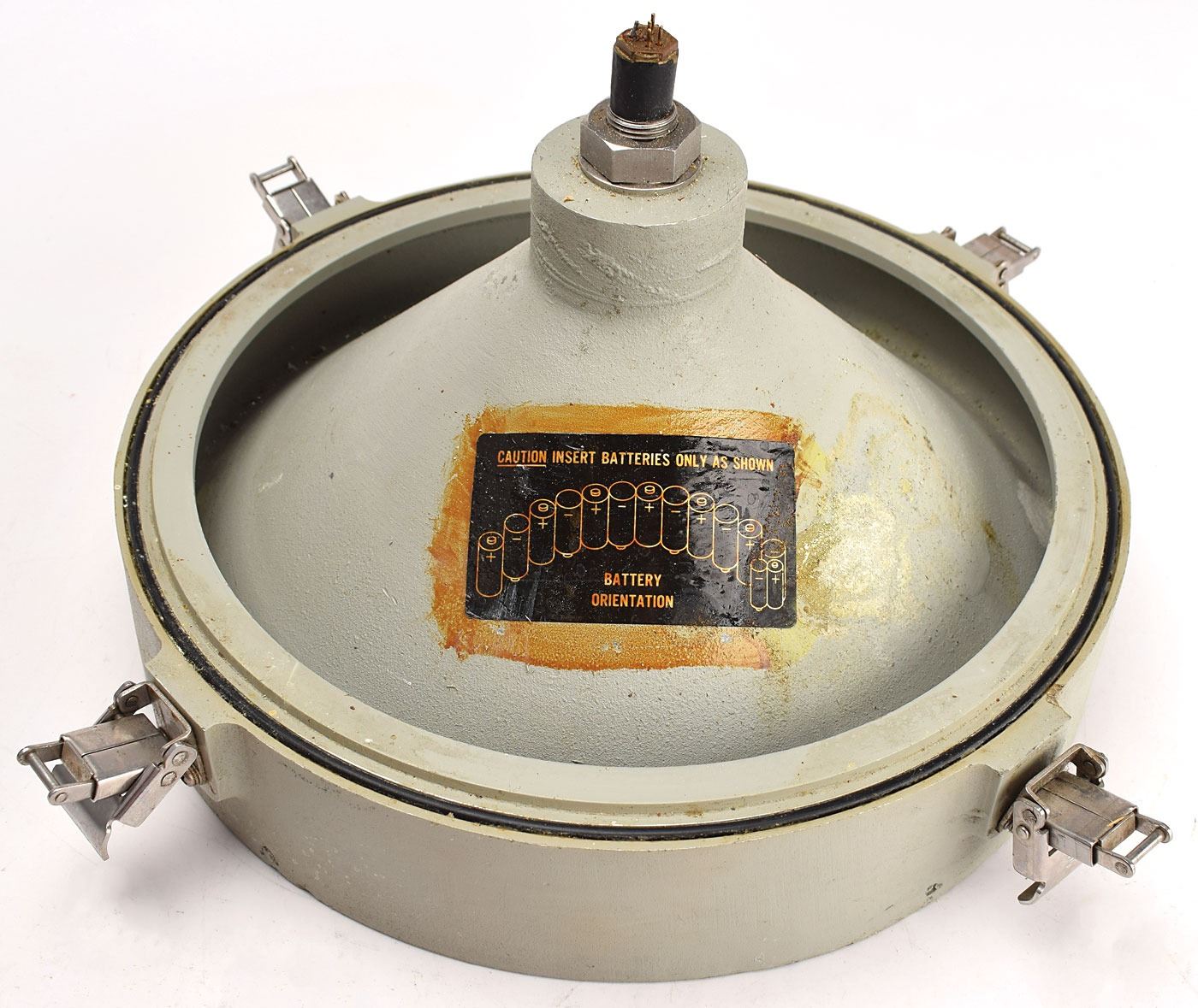 Detecting-ranging portable sonar set made by Futuronics Corp. for use by Navy scuba divers, measuring approximately 12˝ in diameter and 11˝ tall, with knobs on top for "Freq. Control," "Gain," and "Range Listen." Affixed inside is the partial Futuronics label, identifying it as "AN/PQS-1D, Detecting-Ranging Set, Sonar…Serial A00025." In very good to fine condition, with toned adhesive over the inner labels.