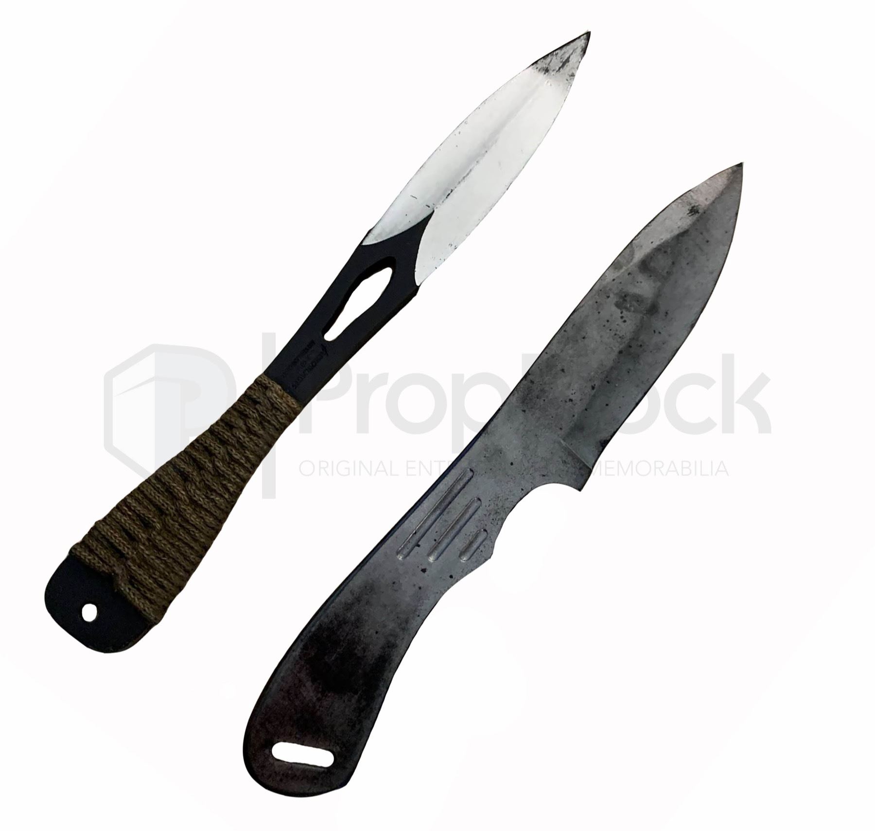 set of two stunt knives used in the production of the2014 science fiction thriller Divergent. In a world divided by factions based on virtues, Tris learns she's Divergent and won't fit in. When she discovers a plot to destroy Divergents, Tris and the mysterious Four must find out what makes Divergents dangerous before it's too late. This set consists of two urethane rubber throwing knives, one silver in color, the other black with a green handle. Each piece remains in excellent, production used condition.