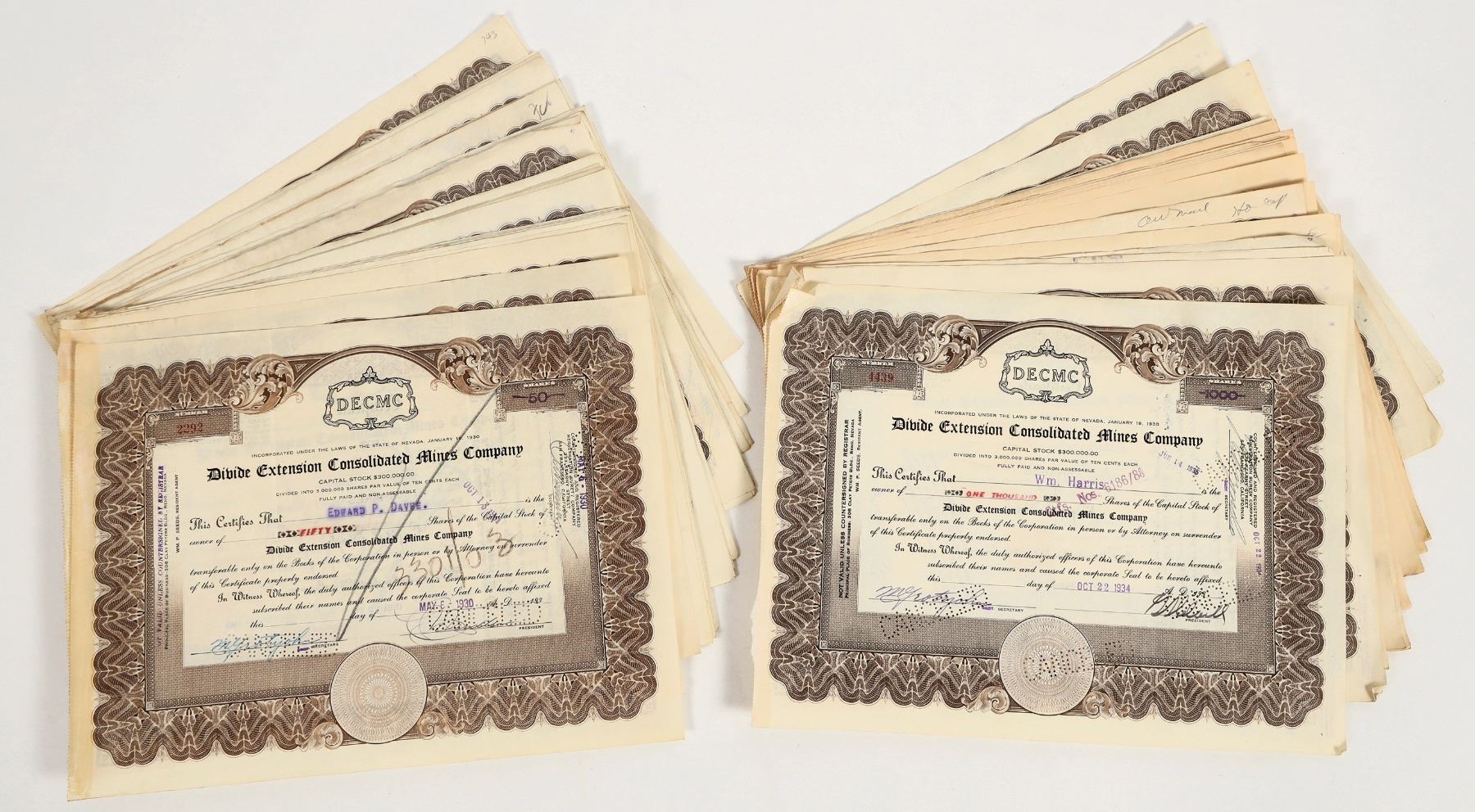 Lot of approx. (100) certificates issued by the "Divide Extension Consolidated Mines Company," operating out of Tonopah Nevada. 1000 Share certificates, punch and stamp cancelled, and fully executed on the reverse. Many of these feature revenue stamps of various denominations on the reverse as well. From the famous Tonopah Divide Mining District, near Gold Mountain. George Wingfield was an investor. Certificates are in good to very good condition, please see photos.
