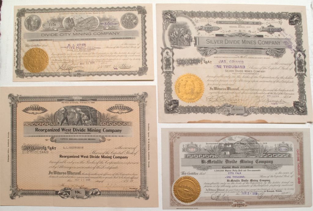 Four stocks including Divide City Mining Company 1926, Bi-Metallic Divide Mining Company 1919, Reorganized West Divide Mining Company 1926, and Silver Divide Mines Company 1919. City: DivideCounty: EsmeraldaState: NV