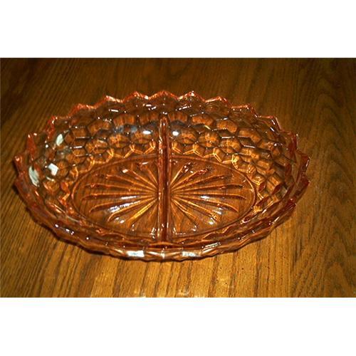 Lovely, Pink, divided, Dish made by the Jeannette Glass Company, (1929-1933). The name of this dish is called: CUBE,"CUBIST". It measures 9 1/2 inches long by 7 inches wide. Inside of each divided area measures 4 5/8 inches. Thickness measures 1/4 inche; bottom base measures 7 inches long ny 4 inches wide. The division area measures 1/4 inch thick. Very heavy with beautiful starburst design in the bottom. No chips, cracks, etc. are seen. Excellent to mint condition.