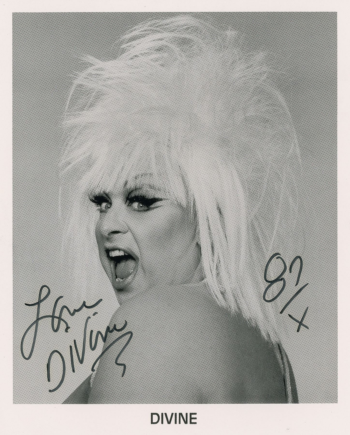 Glossy 8 x 10 publicity photo of the John Waters favorite, signed in black felt tip, "Love, Divine, 87 x." In fine condition.