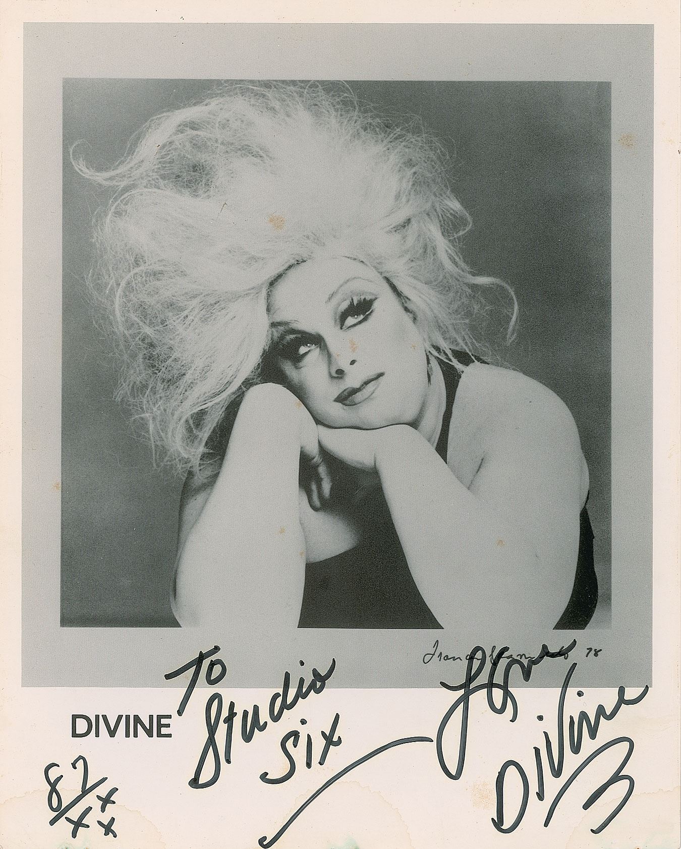 Cardstock 8 x 10 promo photo, signed and inscribed in black felt tip, "To Studio Six, Love, Divine, 87/xxx.” In very good to fine condition, with scattered small stains to the images, and light dampstaining to the lower border.