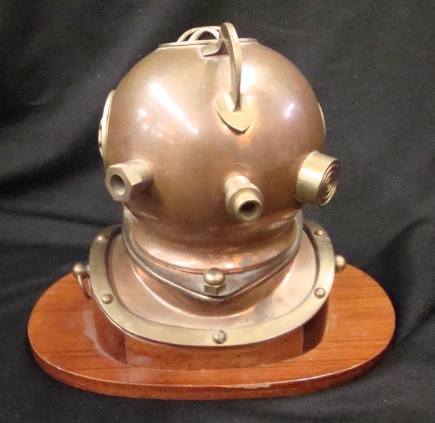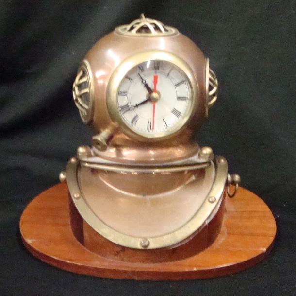 Small brass and copper diving helmet that measures 8x8". Quartz clock that runs on one AAA battery. Clock sits on a teak base that measures 10" across. Fun item