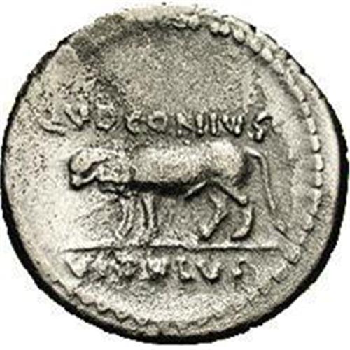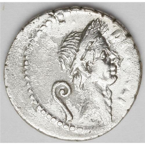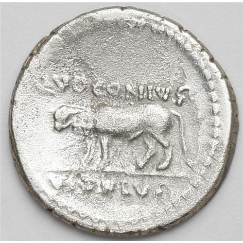 <B>Divus Julius Caesar.</B></I> 40 B.C. AR denarius (19 mm, 3.56 g). Q. Voconius Vitulus, quaestor. Laureate head right; lituus behind / Calf standing left. Crawford 526/2; HCRI 329; Sydenham 1132; RSC 46. VF, porous.