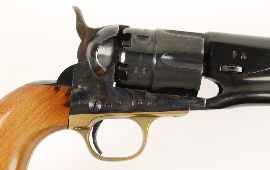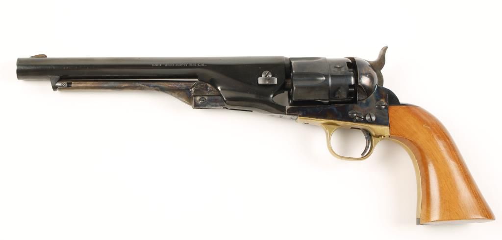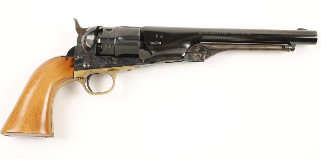 Replica black powder single action 6-shot pistol. 8" blued barrel. Case colored loading lever, frame, hammer and trigger. Blued half-fluted cylinder. Brass trigger guard. Blued steel backstrap. Milled for shoulder stock. Condition is good with some scratches and surface rust. *Antique Firearm*