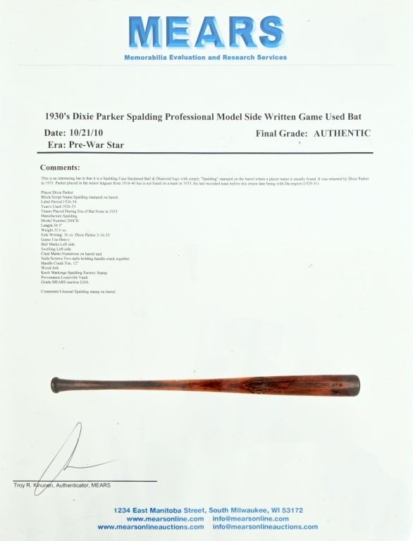 34.75" Length. Comes in plastic tube with MEARS evaluation. Shows cracks from game use.