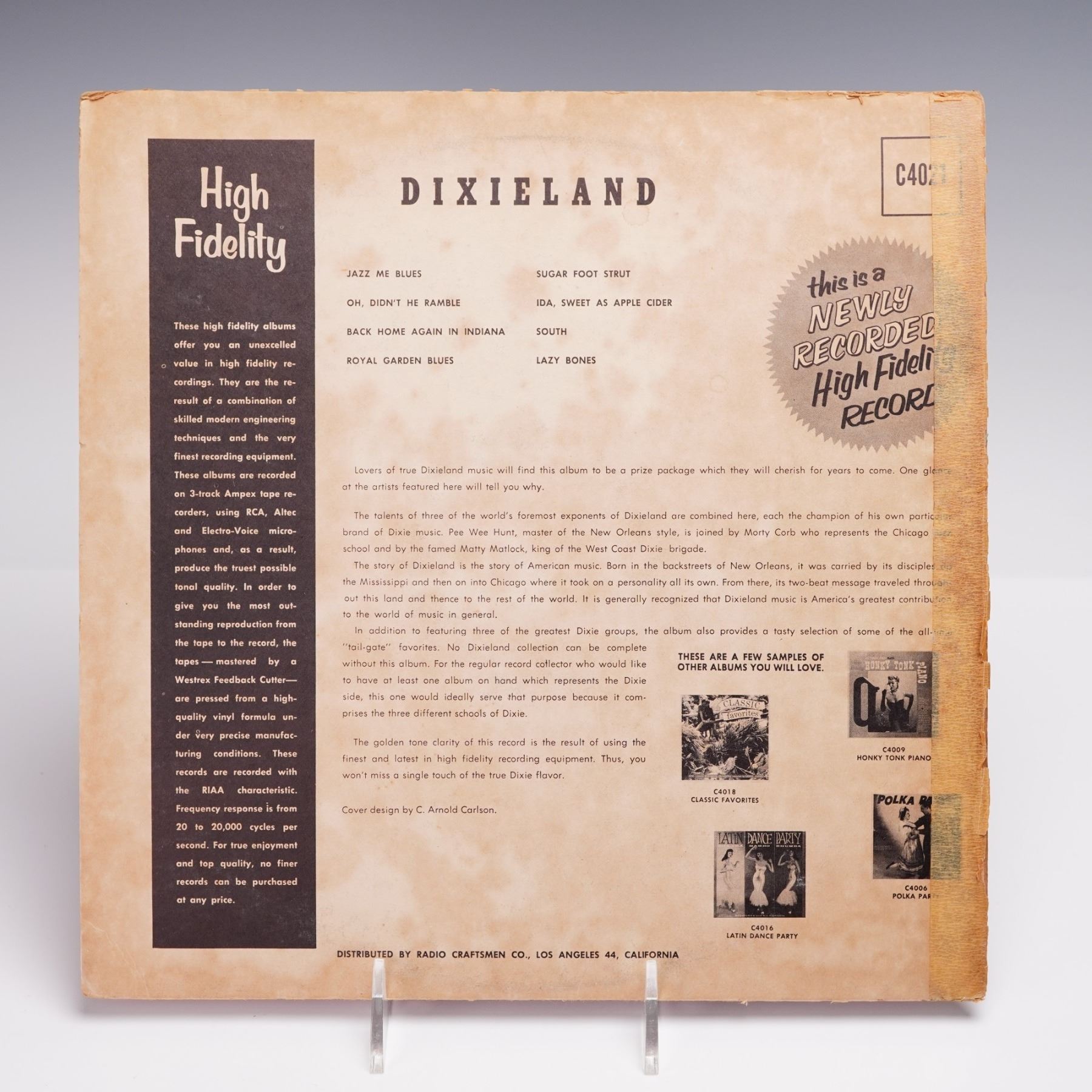 Vintage 33 1/3 RPM vinyl LP titled Dixieland, High Fidelity, featuring some of Dixieland's greatest stars including Pee Wee Hunt, Matty Matlock, Muggsy Spanier, and many others. Released by Golden Tone Hi-Fidelity, catalog number C-4021. The album cover highlights a colorful image of three musicians playing clarinet, trumpet, and drums. Track list includes Jazz Me Blues, Sugar Foot Strut, Oh Didn't He Ramble, Ida Sweet as Apple Cider, Back Home Again in Indiana, South, Royal Garden Blues, and Lazy Bones. The back cover provides detailed notes on the history of Dixieland music and promotes other Golden Tone albums. Distributed by Radio Craftsmen Co., Los Angeles, California. Measures 12.5"L x 12.5"H.