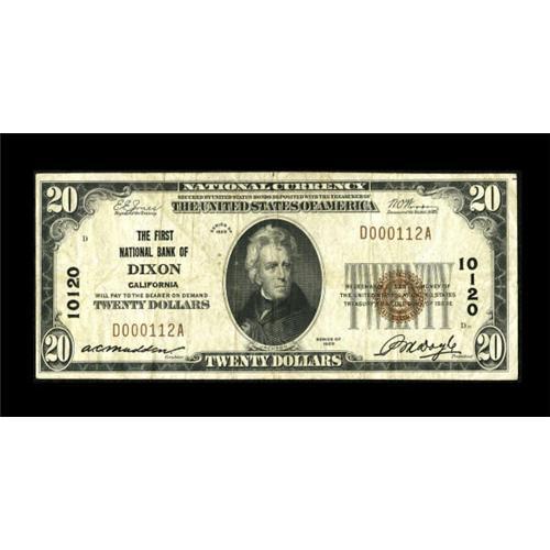 <B>Dixon, CA</B></I> - $20 1929 Ty. 1 <B>The First NB</B></I> Ch. # 10120<BR> An attractive piece from the only bank to issue in this small Solano County community. Pleasing <B>Fine-Very Fine.</B></I><BR><I>From The Kansas City Collection.</B></I><BR><BR><b>Shipping:</b> Coins & Currency (<a target="_blank" href="http://www.heritageauctions.com/common/shipping.php">view shipping information</a>)