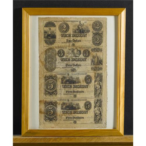 <B>Dixon, IL- Dixon Hotel</B></I> $2-$3-$5-$5 18__ Uncut Sheet<BR>This is the first time we have seen an uncut sheet on this hotel. Presidents Abraham Lincoln, Ulysses S. Grant, Theodore Roosevelt, Willam Howad Taft, and Jefferson Davis have stayed at this hotel. <B>Very Fine,</B></I> with moisture staining.<BR><BR><b>Shipping:</b> Coin/Currency (<a target="_blank" href="http://www.heritageauctions.com/common/shipping.php">view shipping information</a>)