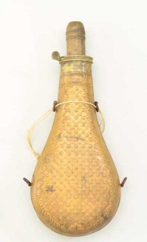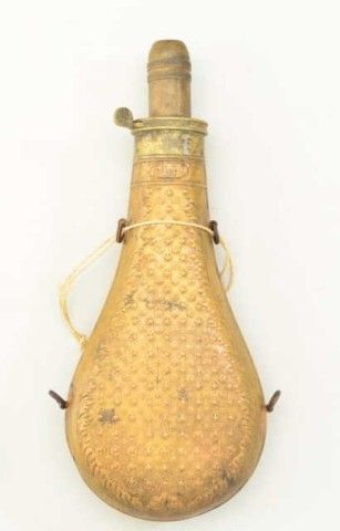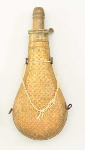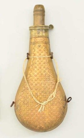 Dixon shotgun flask mid 19th century of generous proportions measuring approx 9-1/4” from tip to end. The body is embossed with small stars and circles with word “Dixon” in banner at top. The spring is weak butworking, four small rings retained, good condition overall, normal aging. Est.;$100-$200.