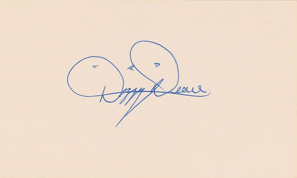 Ballpoint signature, “‘Dizzy’ Dean,” on an off-white 5 x 3 card. In fine condition.