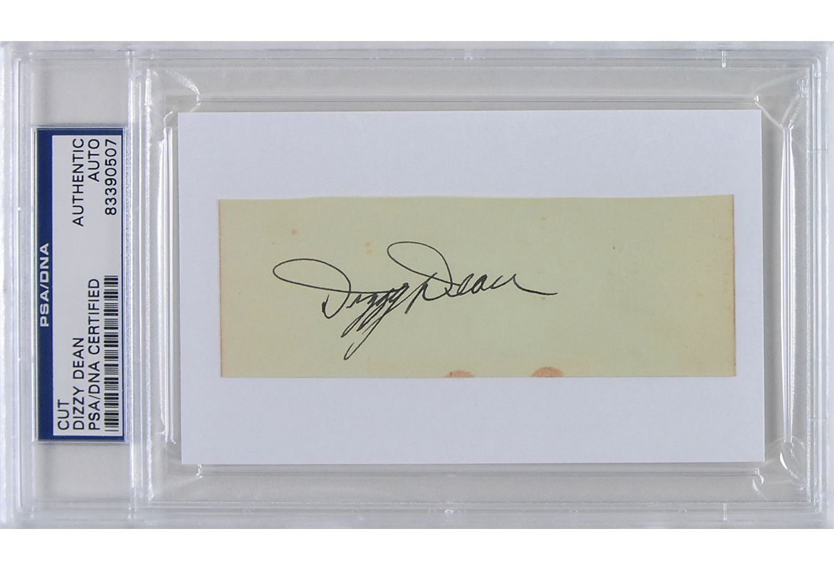 Vintage fountain pen signature, “Dizzy Dean,” on a light green 4.25 x 1.5 slip affixed to a white 5 x 3 card. Encapsulated in a plastic PSA/DNA authentication holder. In fine condition, with a couple spots of foxing and staining (not affecting the bold signature).