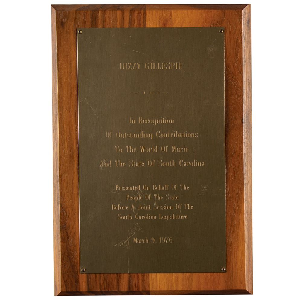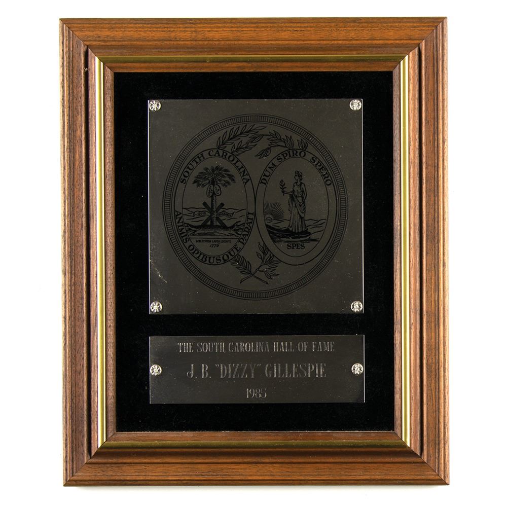 Two plaques awarded to legendary jazz trumpet player Dizzy Gillespie: an 8.25 x 12.25 brass-on-wood plaque, reading: "Dizzy Gillespie, In Recognition of Outstanding Contributions to the World of Music and the State of South Carolina, Presented on Behalf of the People of the State before a Joint Session of the South Carolina Legislature, March 9, 1976"; and a 14.5 x 17.5 plaque featuring a metal-on-velvet design within a wooden frame, featuring the Great Seal of the State of South Carolina, engraved below: "The South Carolina Hall of Fame, J. B. 'Dizzy' Gillespie, 1985." In overall fine condition. Born to a local bandleader in Cheraw, South Carolina, Dizzy Gillespie started to play the piano at the age of four, then taught himself how to play the trombone as well as the trumpet by the age of twelve. He would go on to earn fame as an improvisational jazz trumpet virtuoso, renowned for his showmanship and style.