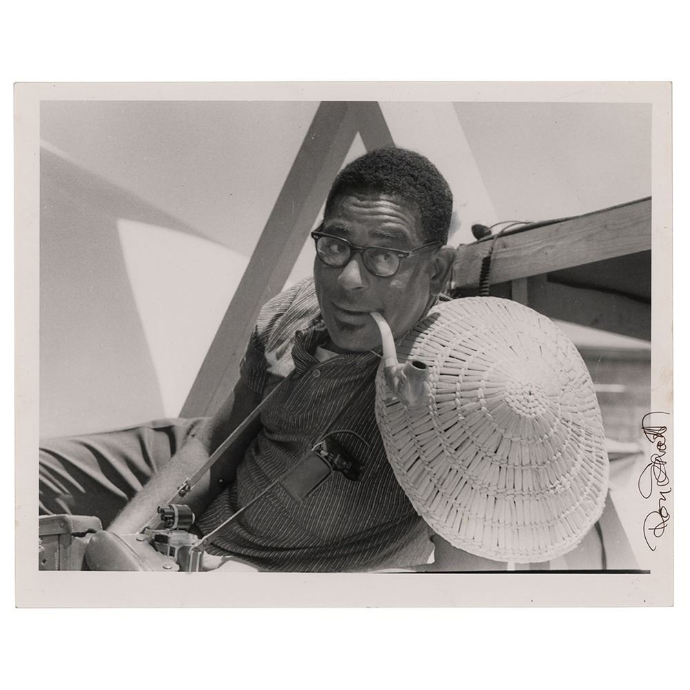 Original glossy 10 x 8 modern silver gelatin print of Dizzy Gillespie by photographer Roy Schatt, which depicts the jazz trumpeter and bandleader with a pipe, straw hat, and camera at the 1957 Newport Jazz Festival, signed vertically along the right border in black ink by Schatt, with the reverse bearing his credit stamp. In fine condition.