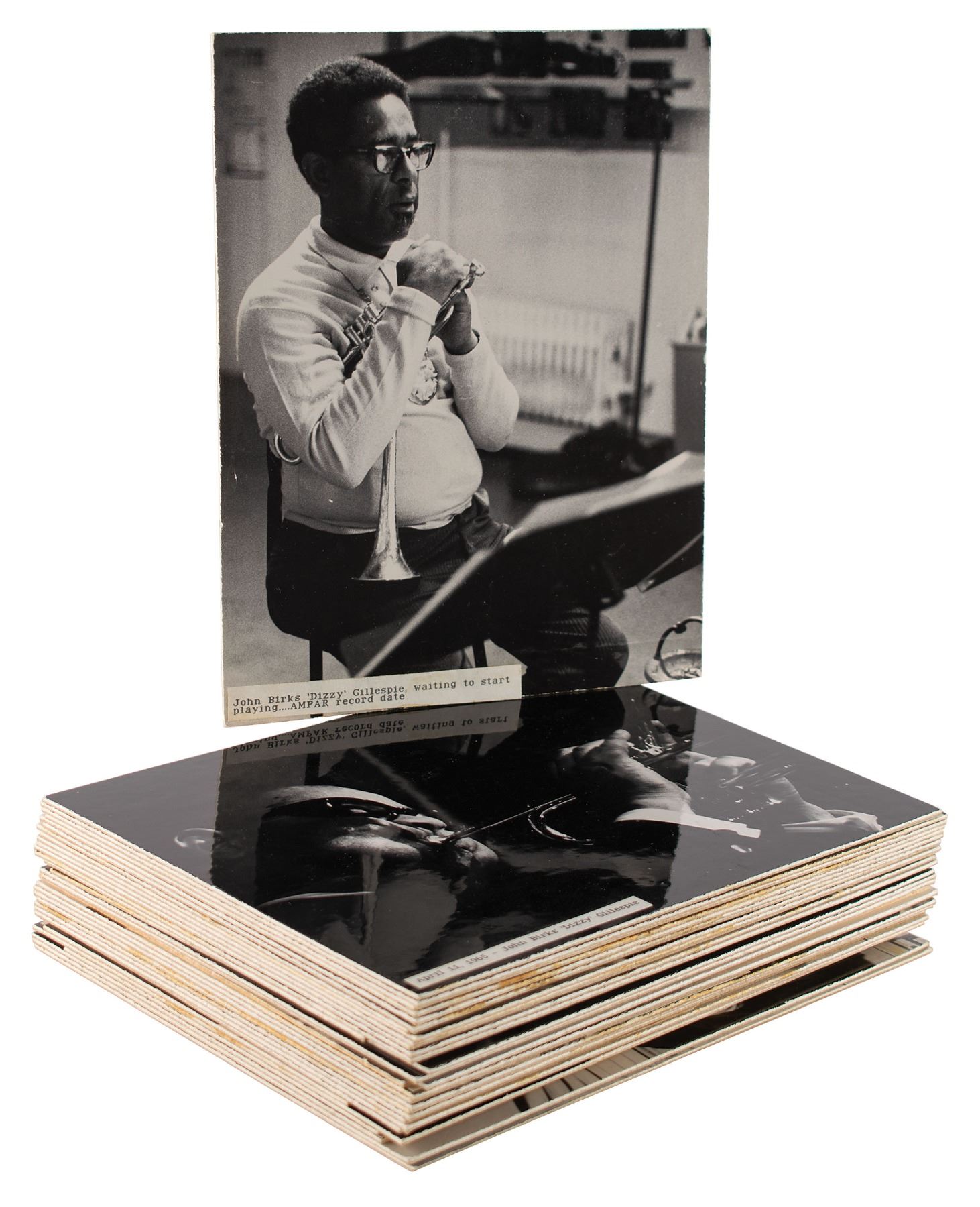 Group of 32 original silver gelatin photos of Dizzy Gillespie taken by noted jazz photographer Raymond Ross, most measuring 7.5 x 9.5, affixed to same-size mounts with typed captions on the front, as prepared for an exhibition. All bear Raymond Ross credit stamps on the reverse. Images date from 1965 to 1987 (but focus on the late 1960s and early 1970s), and show Gillespie performing, in studio, playing chess, alongside other jazz legends (like Bud Powell, James Moody, Max Roach, Sonny Stitt, and others), and various portraits. In overall fine condition.