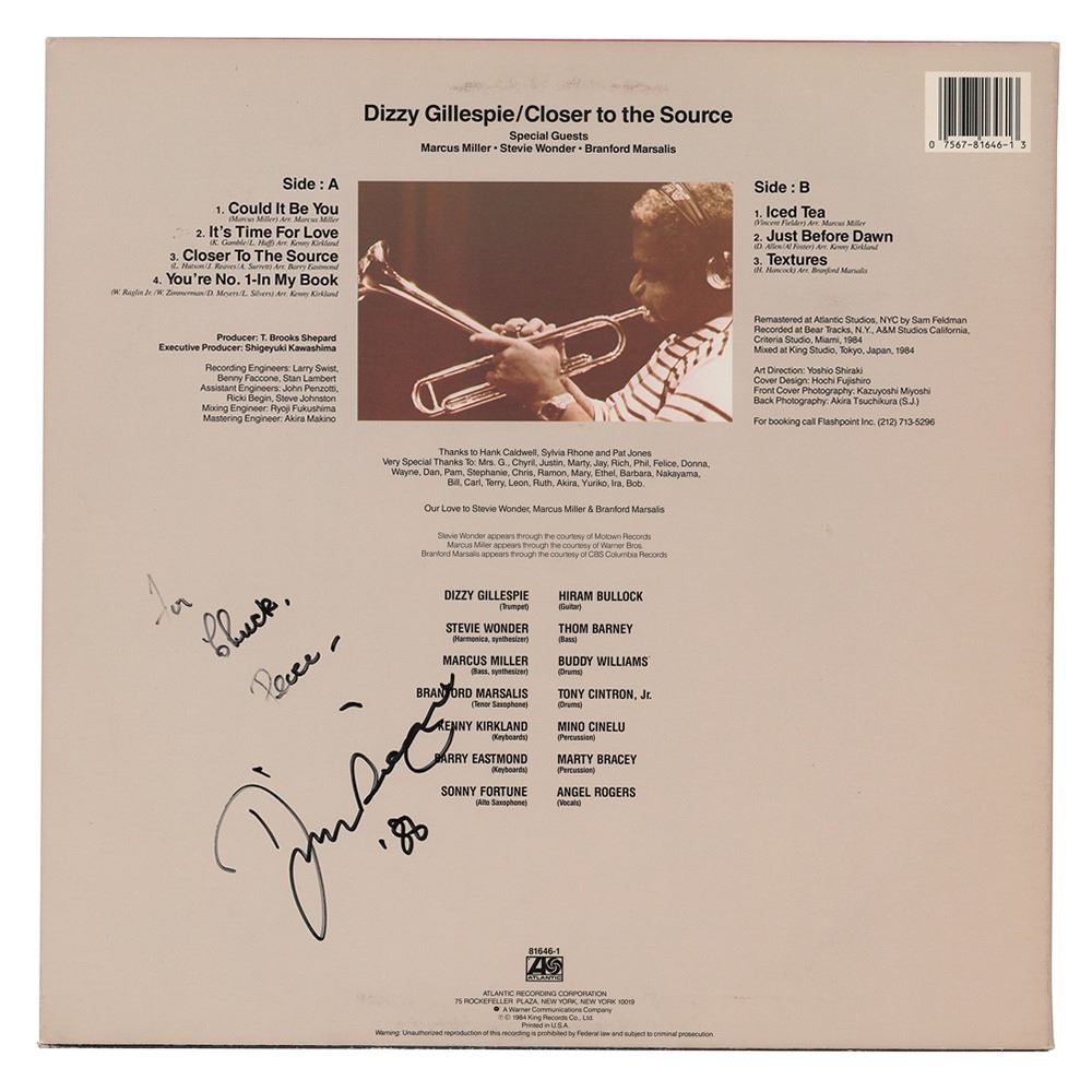 Closer to the Source album signed and inscribed on the reverse in black felt tip, "For Chuck, Peace‰ÛÓDizzy Gillespie, '86." In fine condition. The record is included.