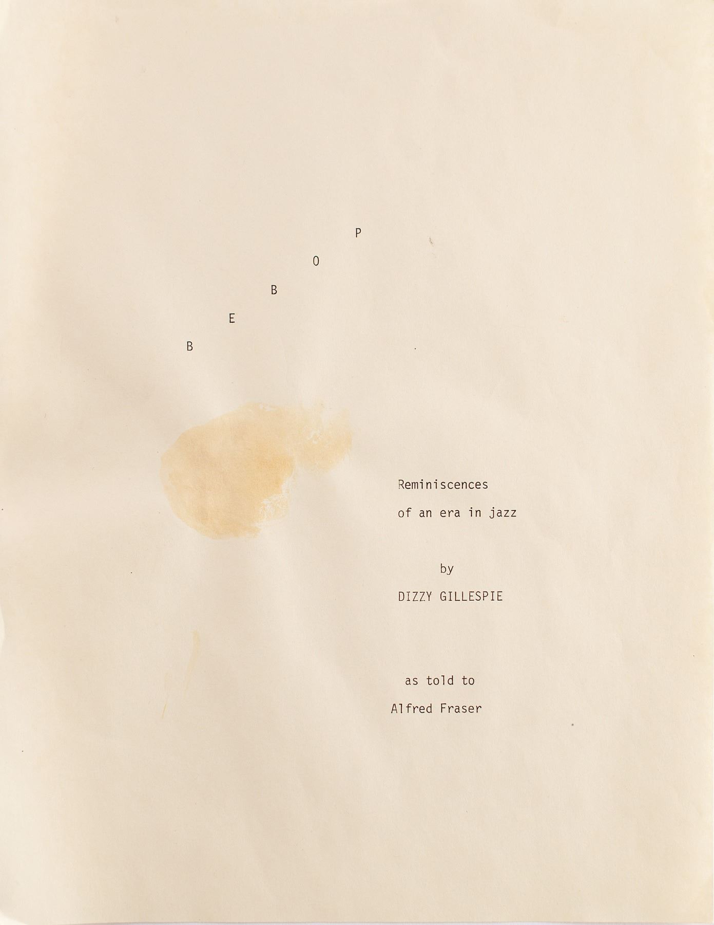 Typed draft of a manuscript entitled "Bebop: Reminiscences of an Era in Jazz by Dizzy Gillespie, as told to Alfred Fraser," 849 pages, 8.5 x 11, circa mid-to-late 1970s. The book, which would undergo substantial revisions, would later be published in 1980 under the title 'To Be or Not to Bop.' Includes a TLS by Al Fraser, signed "Al," one page, June 22, 1974, transmitting a very early draft of his life story and requesting revisions, as well as offering a suggestion for publication: "We're thinking about making this the first audio book with a cassette tape in the back containing all the 'most representative' recordings you've made through the years and your own voice commentary on them. It's a hell of an idea that's never been done before." Also includes 1980 letters from Doubleday concerning the sale of foreign publication rights. In overall very good to fine condition, with creasing to the letters and a stain to the title page of the manuscript.