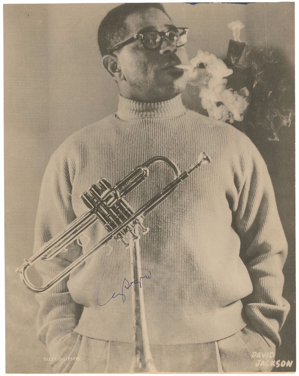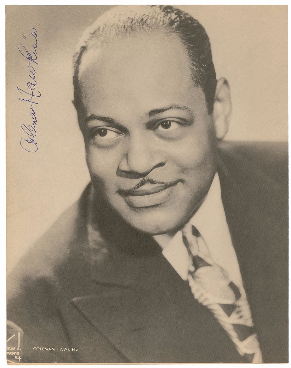 Double-sided vintage 10.5 x 13.5 program photo of a smoking Dizzy Gillespie on one side and a handsome Coleman Hawkins in a suit and tie on the other, both signed in blue ballpoint. In fine condition. The Larry Rafferty Collection.
