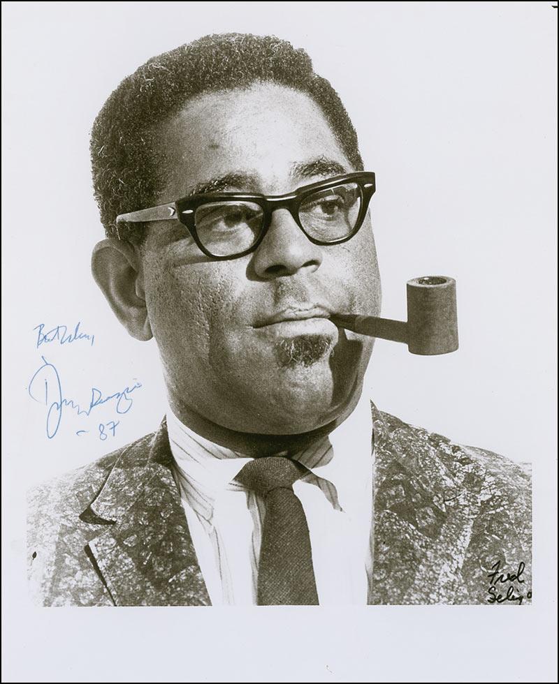 Glossy 8 x 9.75 photo of Gillespie smoking a pipe, signed in blue ballpoint “Best Wishes, Dizzy Gillespie ‘87.” In fine condition, with lightly trimmed top edge.