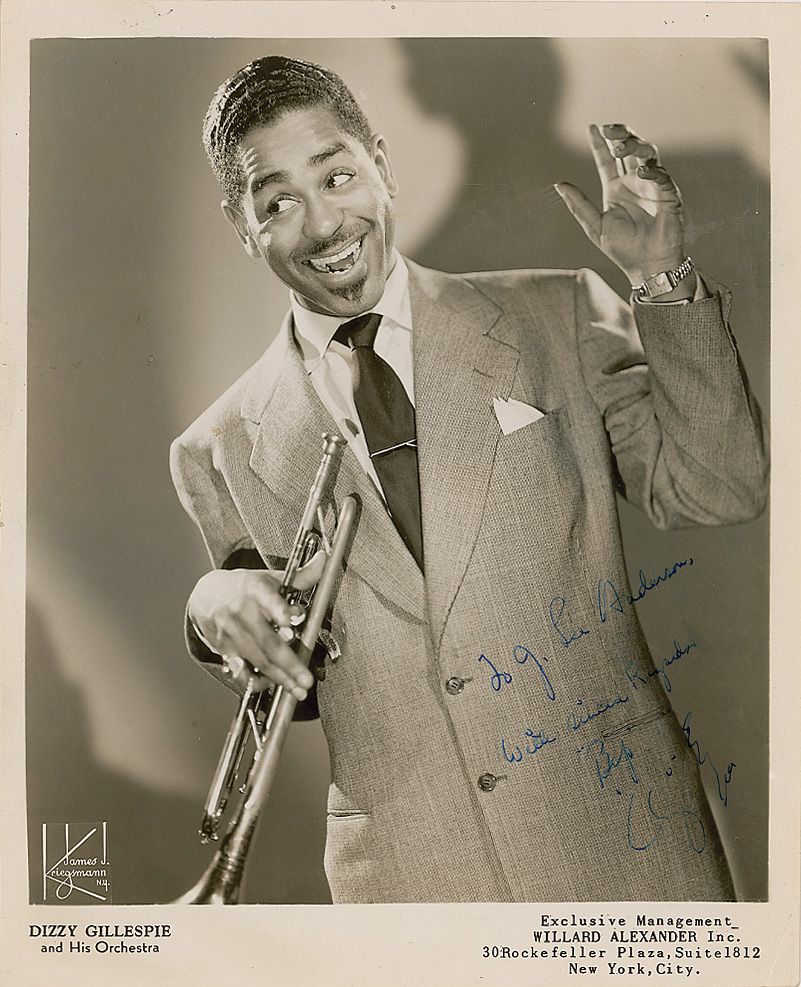 Vintage glossy 8 x 10 publicity photo for Gillespie and his orchestra, signed and inscribed “To J. Lee Anderson, with sincere regards, ‘Bip,’ Dizzy Gillespie.” Scattered creases throughout and a tack hole to the top border, otherwise fine condition.