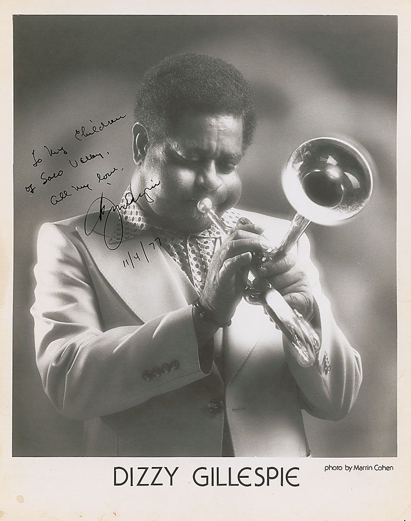 Great glossy 8 x 10 publicity photo of Gillespie blowing his horn, signed and inscribed in black ink, “To my children of Saco Valley, all my love, Dizzy Gillespie, 11/4/77.” A few small stains and creases to lower portion, otherwise fine condition.