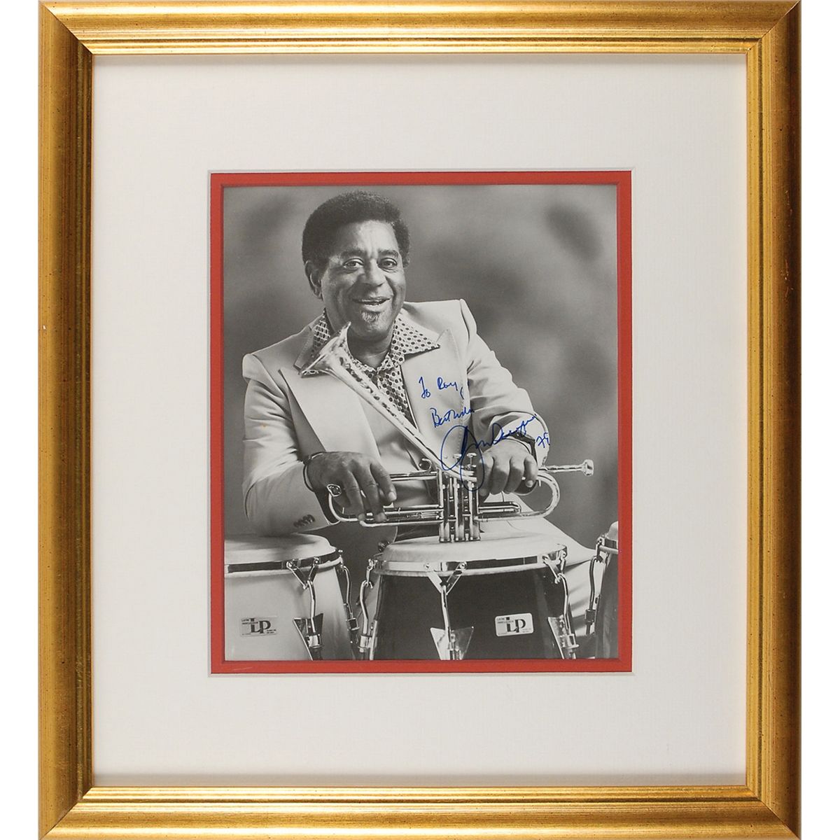 Glossy 7 x 8.75 photo of the jazz trumpet legend posing with his instrument and some drums, signed and inscribed in black felt tip, “To Roy, Best wishes, Dizzy Gillespie, ’79.” Double-matted and framed to an overall size of 14 x 15.5. In fine condition.