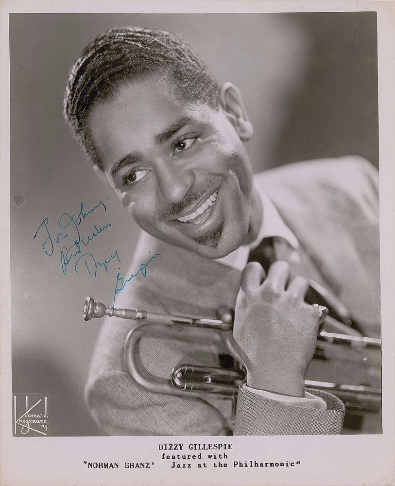 American jazz trumpeter, bandleader, composer, and singer (1917–1993), who was a major figure in the development of bebop and modern jazz. Vintage glossy 8 x 10 publicity photo of Gillespie by James J. Kriegsmann of New York, signed and inscribed in blue ink, "For Johnny, Best wishes, Dizzy Gillespie.” In fine condition.