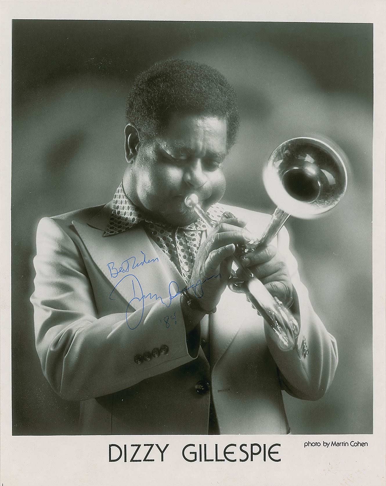Glossy 8 x 10 publicity photo of Gillespie blowing his horn, signed in blue ballpoint, "Best wishes, Dizzy Gillespie, '84." In fine condition.