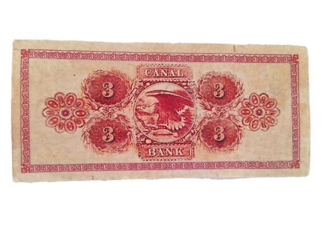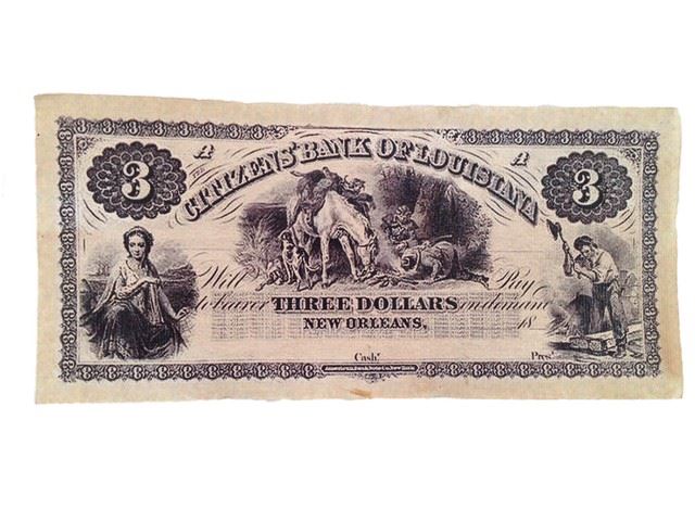 Screen used, "Citizen's Bank of Louisiana" Three dollar bank note. (approx. 7" x 3") Condition May Vary Slightly.