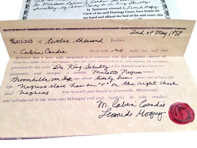 Broomhilda (Kerri Washington) screen used, hero, freedom papers. Includes three separate sheets: 1 sheet that shows she is free and the other two are her purchase papers.(10x8)