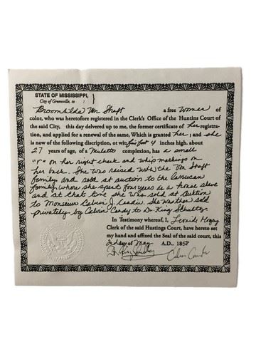 Screen used, "State of Mississippi" Broomhilda von Shaft's (Kerry Washington) paper work showing she is free woman. (9x9)