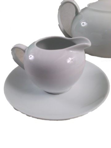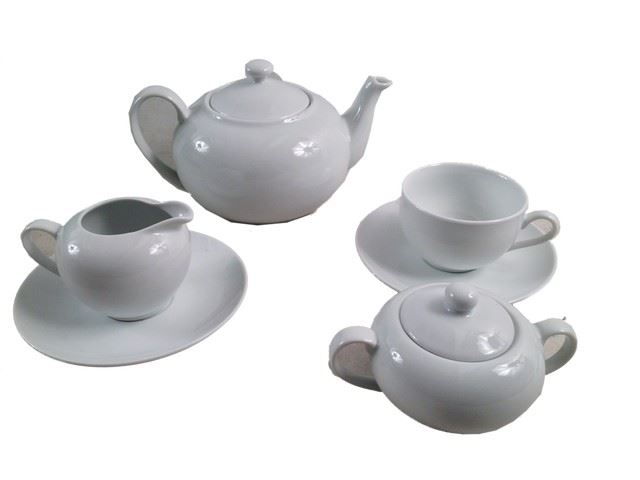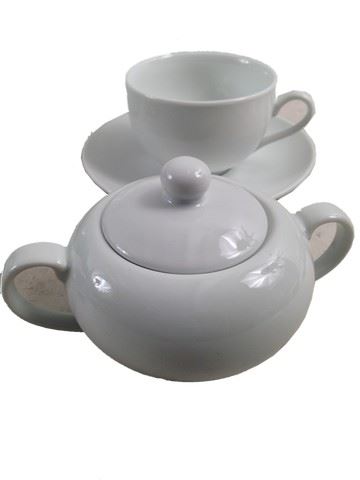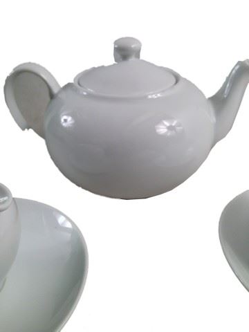 White porcelain tea set. Includes tea pot with 1 tea cup and saucer, a creamer bowl with saucer and a sugar bowl. Used on the set of production. (9x7)