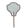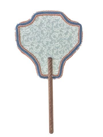Screen used, hand held fan with custom design and hand stitching around the boarder of the fan, handle is made of wood. (19x10)