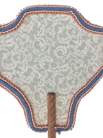 Screen used, hand held fan with custom design and hand stitching around the boarder of the fan, handle is made of wood. (19x10)