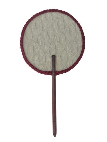 Screen used, hand held fan with custom design and hand stitching around the boarder of the fan, handle is made of wood. (18x9)