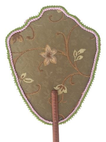 Screen used, hand held fan with custom design and hand stitching around the boarder of the fan, handle is made of wood. (21x9)