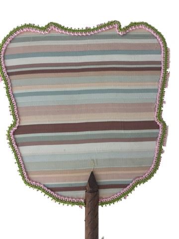 Screen used, hand held fan with custom design and hand stitching around the boarder of the fan, handle is made of wood. (20x9)