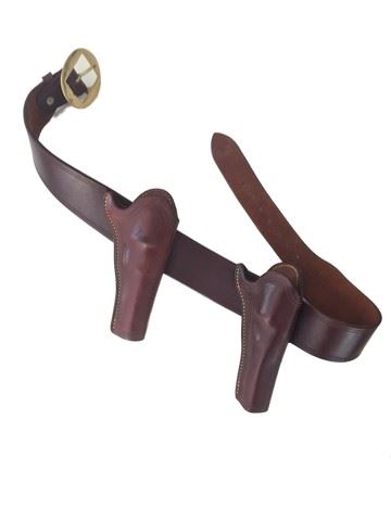 Screen use, brown leather gun holster belt with two gun holster holders and a gold buckle.(44x9)