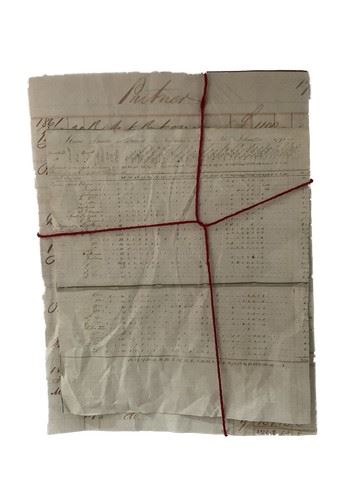 Custom designed by the art department, this is a screen used, tied stack of paperwork from the Candie Plantation.