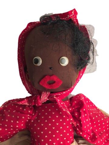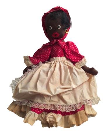 Stuffed African America doll with a red dress and off white apron, the doll is meant to sit as decoration with no legs and a flat body at the bottom for sitting on a shelf.(19x5)