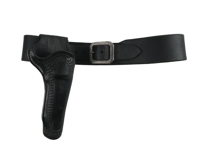 Dr. King Schultz (Christoph Waltz) black leather with metal buckle gun belt with hard black leather gun holster.
