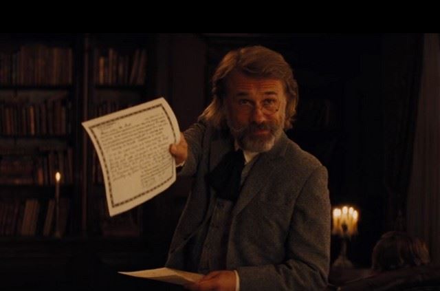 Dr. King Schultz (Christoph Waltz) screen used, hero, legal documents signed by Calvin Candie (Leonardo DiCaprio).