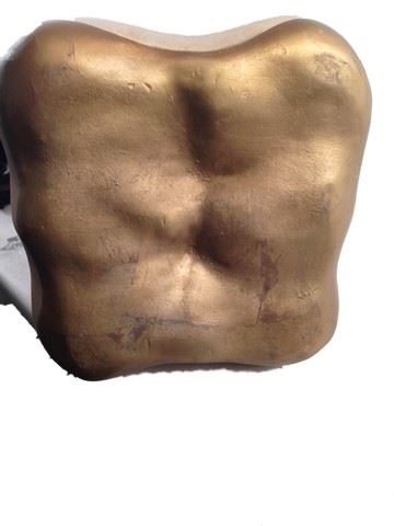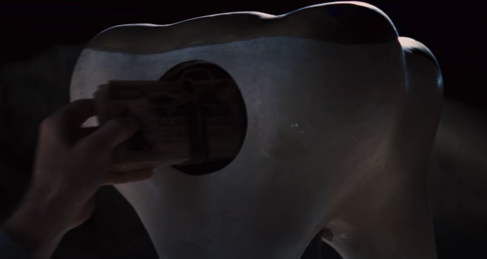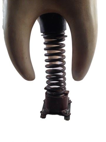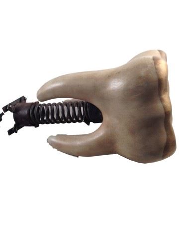 Dr. King Schultz (Christoph Waltz) screen used, hero, giant molar on a spring, this was bolted to the top of his dental wagon, the molar has a gold crown painted on the occlusal surface and has three roots. This is the one seen up close when he opens the hole and places the money inside. This tooth is one of three from the production and is made of the most solid material. The other two are made from styrofoam. (28x15)